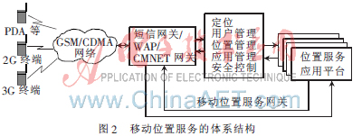 移動位置服務是移動運營商提供給移動用戶的增值服務,因此實施移動位置服務應該充分利用運營商的現(xiàn)有網(wǎng)絡投資。根據(jù)現(xiàn)有移動通信的網(wǎng)絡結構,提出了如圖2所示的系統(tǒng)結構。這種結構是在現(xiàn)有移動通信網(wǎng)絡實體上的延伸,增加了移動位置服務網(wǎng)關模塊和移動位置應用平臺模塊。移動位置服務網(wǎng)關完成相當多的功能,如用戶管理、位置管理、應用管理、定位等,許多有關用戶的定位信息都在服務網(wǎng)處理,并提交給位置服務應用平臺。位置服務應用平臺類似于一臺服務器,它與移動用戶終端進行交互,將用戶的定位信息通過合適的數(shù)據(jù)格式傳輸給訂制了該業(yè)務的用戶。