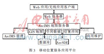 移動位置服務應用平臺相當于移動通信網(wǎng)絡中的定位服務器,它接收來自于移動位置服務網(wǎng)關中經(jīng)過處理的定位信息,并在位置服務應用平臺中經(jīng)過再處理。由于移動用戶終端機的生產廠商各不相同,使用不同的嵌入式軟件等,因此位置服務應用平臺服務器能夠為不同的終端用戶提供服務。系統(tǒng)可以配合短消息服務確定手機用戶所在的地理位置,也能夠以Web形式響應用戶的需求[5]。移動位置服務的應用平臺結構如圖3所示!