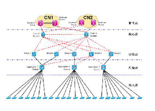 現(xiàn)在中國是世界上最大互聯(lián)網(wǎng)國家,我們國家有著最大的互聯(lián)網(wǎng)使用群體。據(jù)中國互聯(lián)網(wǎng)絡信息中心(CNNIC)發(fā)布的《第25次中國互聯(lián)網(wǎng)絡發(fā)展狀況統(tǒng)計報告》數(shù)據(jù)顯示,截至2009年12月,我國網(wǎng)民規(guī)模已達3.84億,互聯(lián)網(wǎng)普及率進一步提升,達到28.9%。據(jù)預測,到2010年底,網(wǎng)民數(shù)量將超過5億。三大運營商在今年的寬帶用戶數(shù)數(shù)量近2億(1)。如此龐大的用戶規(guī)模群體對運營商網(wǎng)絡是一個嚴峻的考驗,F(xiàn)在的運營商網(wǎng)絡,仍然是接入層,匯聚層和核心層三層架構為主體,總的帶寬近40T。以中國電信集團為例,運營商的現(xiàn)有IP骨干網(wǎng)絡架構一般如下圖所示: