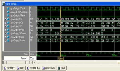 主模塊yuv2rgb實現(xiàn)子模塊的調(diào)用,用Modelsim進行了仿真。仿真波形如圖7所示: