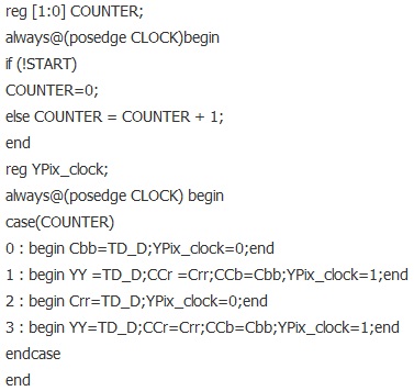 以上代碼完成了圖3的功能,輸入的信號名為TD_D,輸出的三路信號是Cbb,YY,Crr。注意到還有個YPix_clock,實際上是27M的2分頻,這個時鐘非常有用,在下面將詳細闡述。