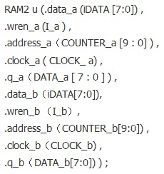 方法2 可以這樣實現(xiàn):在FPGA內(nèi)部使用Megacore,構(gòu)造一個雙口的RAM,雙口RAM的輸入輸出信號的硬件描述語言定義如下: