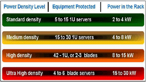 當(dāng)企業(yè)部署刀片式服務(wù)器來宿主其虛擬服務(wù)器時(shí)尤其如此。刀片式服務(wù)器采用多個(gè)即插即用型處理裝置,它們共享公共的電氣系統(tǒng)、電源、風(fēng)扇、電纜和存儲(chǔ)器。這樣的安排節(jié)省了數(shù)據(jù)中心的占地面積,簡(jiǎn)化了硬件管理,并提高了IT靈活性。然而,這同時(shí)也大大增加了運(yùn)算密度。結(jié)果,刀片式服務(wù)器產(chǎn)生大量的熱,從根本提高了機(jī)柜級(jí)供電要求。確實(shí),一個(gè)典型的傳統(tǒng)服務(wù)器機(jī)柜可能需要4至6 kW電力,而一個(gè)典型的布滿刀片式機(jī)架的機(jī)柜則可能需要高達(dá)30 kW的電力,遠(yuǎn)遠(yuǎn)超過許多電源和冷卻系統(tǒng)的處理能力。