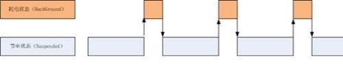 為了節(jié)約電池的電量,智能手機(jī)上的操作系統(tǒng)的一個(gè)基本策略是,盡量減少正在運(yùn)行的程序,這個(gè)道理很簡(jiǎn)單,運(yùn)行的程序越多,需要耗費(fèi)的 CPU 計(jì)算時(shí)間就越多,電量就省不下來。下面的圖是蘋果 iOS 設(shè)備應(yīng)用程序調(diào)度狀態(tài)圖,事實(shí)上蘋果設(shè)備是除了用戶正在操作的程序,其他打開的程序進(jìn)程盡可能都放到“掛起(Suspended)”的狀態(tài)下。在“掛起”的狀態(tài)下面,程序進(jìn)程處在休眠狀態(tài),不耗費(fèi) CPU 計(jì)算能力。當(dāng)用戶沒有對(duì)設(shè)備進(jìn)行操作的時(shí)候,整個(gè)系統(tǒng)處在休眠的低電狀態(tài)。(這里進(jìn)程的意思是:程序運(yùn)行實(shí)例)