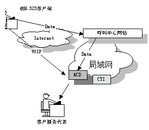 國際上一些先進的 呼叫中心產(chǎn)品供應(yīng)商現(xiàn)在已經(jīng)把 Web 技術(shù)引入到他們的產(chǎn)品中了。通過屏幕上的一個按鈕可以利用 Internet 電話把客戶和呼叫中心連接起來。客戶使用一個很普通的帶有麥克風(fēng)﹑聲卡以及傳輸速率不小于 28.8 kbps 的Modem 的多媒體 PC 機,并配有 Web 瀏覽器以及與 H.323兼容的應(yīng)用軟件就可以利用把他們連接到 Web 站點的那條電話線與呼叫中心的座席員交談。其簡單示意圖如下: