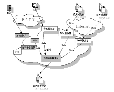 多媒體呼叫中心實際上是基于CTI 技術(shù)的傳統(tǒng)呼叫中心與 ICC 的相互結(jié)合。現(xiàn)在許多呼叫中心把各種媒體通信技術(shù)集成到了一起,允許座席員同時可以處理語音呼叫﹑Web請求﹑e-mail和傳真。其簡單示意圖如下: