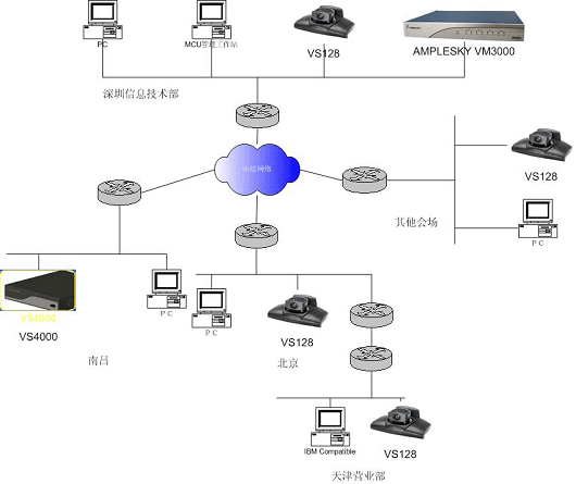 江南證券有限責任公司骨干帶寬為512K,由于IP損耗,真正能建立的會議帶寬為384K。由于為本次視頻會議系統(tǒng)配置的Amplesky公司的VM3000可支持8用戶512K會場,即使將來帶寬增加,需建立512K帶寬會議時也能滿足需要,無需再投資。當會議規(guī)模需要擴大時,只需購買升級軟件,而無需再投資硬件設備,VM3000可擴展到支持36用戶。
