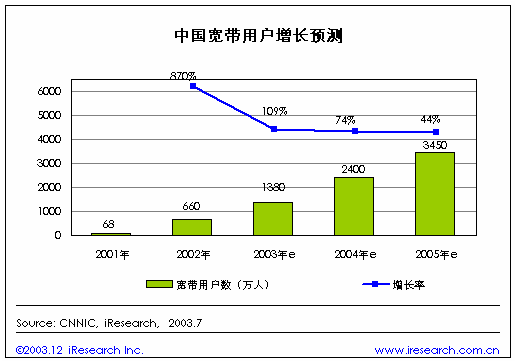 進(jìn)入2003年下半年,幾乎所有人都可以明確地感受到中國寬帶市場的不斷升溫。中國電信、中國網(wǎng)通這兩大運營商以爭奪寬帶用戶、擴(kuò)大市場占有率為目標(biāo)的價格戰(zhàn)全面打響,并且日趨白熱化。寬帶接入的價格門檻以令人難以置信的速度不斷下調(diào)。與此同時,寬帶用戶的數(shù)量則呈現(xiàn)雪崩式激增,一條以寬帶運營商為龍頭,涵蓋軟件提供商、互聯(lián)網(wǎng)內(nèi)容服務(wù)商、計算機(jī)生產(chǎn)商、設(shè)備制造商等在內(nèi)的寬帶產(chǎn)業(yè)鏈正在迅速形成,并且不斷壯大。中國的寬帶市場進(jìn)入前所未有的繁榮期。