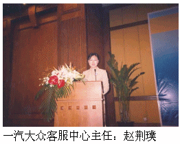 一汽大眾客服中心主任趙荊璞由于其在客戶(hù)服務(wù)方面的杰出貢獻(xiàn)被評(píng)為"2005中國(guó)最佳呼叫中心管理人",并作為獲獎(jiǎng)代表在大會(huì)上發(fā)了言。?