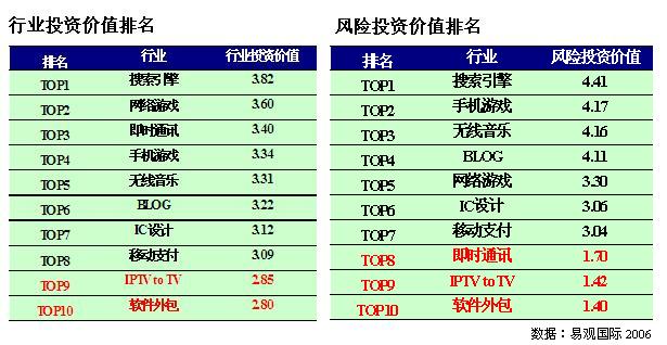 3G 牌照的發(fā)放,手機(jī)游戲、無(wú)線音樂(lè)、移動(dòng)支付、博客等行業(yè)投資潛力都將有所提高,其中手機(jī)游戲、無(wú)線音樂(lè)和博客分別列居第二、第三、第四,成為未來(lái)三年中高增長(zhǎng)行業(yè)。即時(shí)通訊行業(yè)投資價(jià)值排名第三,由于其商業(yè)模式的低創(chuàng)新,致使其風(fēng)險(xiǎn)投資價(jià)值僅為倒數(shù)第三,不具備風(fēng)險(xiǎn)投資價(jià)值。隨著汽車(chē)行業(yè)、消費(fèi)電子行業(yè)逐步向智能化、數(shù)字化發(fā)展,IC