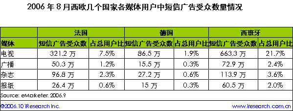 iResearch艾瑞市場(chǎng)咨詢根據(jù)eMarketer資料整理顯示,短信廣告在西歐國(guó)家大行其道,成百上千萬(wàn)的移動(dòng)用戶訂閱了廣告短信。西歐各國(guó)不同媒體訂閱廣告短信的用戶數(shù)不盡相同?傮w上來(lái)看,西班牙的短信廣告受眾最多,電視用戶中有21.7%人訂閱了短信廣告,數(shù)量達(dá)663.3萬(wàn)。相比之下,法國(guó)電視用戶中的短信廣告受眾只有西班牙的1/2,德國(guó)則更少。