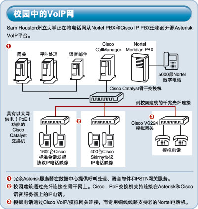 SHSU到目前為止已經(jīng)將1600 部IP電話由Cisco CallManager遷移到Asterisk上,后者運(yùn)行IETF標(biāo)準(zhǔn)的SIP。Asterisk的功能將分布在幾臺(tái)冗余Dell服務(wù)器上:其中兩臺(tái)作為冗余PSTN網(wǎng)關(guān);