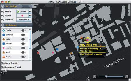 該軟件名為iFind,乍一看類似任何典型的即時通信軟件,也需要雙方相互邀請,這樣才能進入對方的好友名單。用戶可以選擇暫時隱藏起來,不讓某個好友或者整個群組看見自己,他們還可以完全把某人從好友名單中刪除。不過iFind的好友名單增加了地圖,可以實時顯示這些朋友在MIT校園的哪個角落。地圖顯示了通過Wi-Fi登錄到MIT網(wǎng)絡上的好友,讓用戶可以為每個朋友創(chuàng)建獨特的迷你頭像,能看到誰在學校河邊閑逛、誰在樓上圖書館看書。