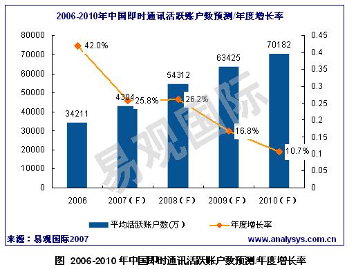2007年中國即時通訊活躍賬戶數(shù)將達4.3億,未來3年增幅呈現(xiàn)下滑趨勢
