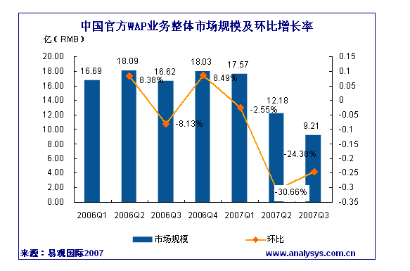 易觀國際研究表明,2007年第3季度中國官方WAP市場規(guī)模達到9.21億人民幣,同比下降44.57%。中國移動WAP頁面“資費提醒”政策對市場的影響已得到控制,與2季度WAP市場規(guī)模逐月遞減現象相比,2007年7月、8月、9月WAP市場規(guī)模呈現穩(wěn)步增長趨勢。中國聯(lián)通WAP市場規(guī)模為1.065億元,同比下降47.55%,自中國聯(lián)通四月份改實收結算后,信息費一直呈現下降趨勢。