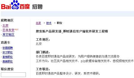 百度有意推IM產(chǎn)品的傳聞?dòng)蓙硪丫,不過該傳聞一直未得到官方證實(shí)。但在其官網(wǎng)最新公布的招聘頁(yè)面中,百度已向外界羅列出即時(shí)通信客戶端軟件研發(fā)工程師(搜索新產(chǎn)品研發(fā)部)、即時(shí)通信軟件產(chǎn)品經(jīng)理(客戶端軟件業(yè)務(wù)部)等職位,上述工作地點(diǎn)均在北京,可見百度的IM戰(zhàn)略布局已具雛形。