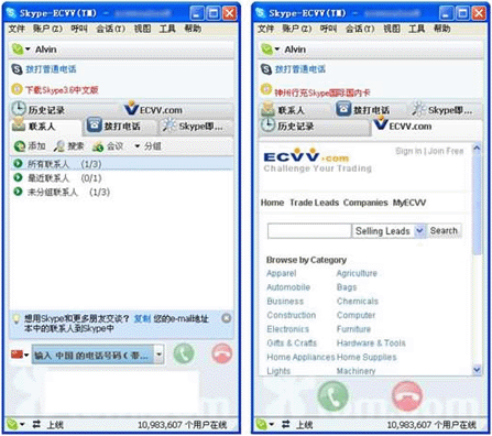 據(jù)ECVV網(wǎng)站介紹,Skype-ECVV貿(mào)易版是基于Skype即時(shí)通訊軟件,專門為中國及全球貿(mào)易人士精心打造的在線溝通工具,由ECVV.com與Skype共同開發(fā)完成。用戶下載此版本的Skype軟件后,可以在軟件主界面上方看到“ECVV.com”定制頁面,點(diǎn)擊即可進(jìn)入并享受ECVV全站海量的貿(mào)易信息。