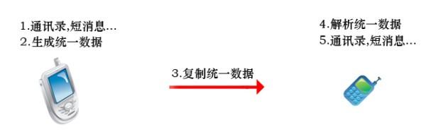 對(duì)于新出的手機(jī)型號(hào),如果可以通過(guò)手機(jī)直接生成統(tǒng)一格式的交換數(shù)據(jù),并且可以通過(guò)手機(jī)直接解析其他手機(jī)生成交換數(shù)據(jù),示意圖如下: