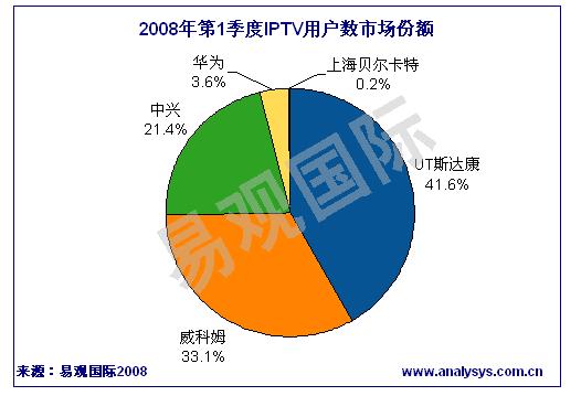 《2008年第1季度中國IPTV市場季度監(jiān)測》數(shù)據(jù)顯示,2008年第1季度中國IPTV累計(jì)用戶數(shù)達(dá)131萬人。根據(jù)各廠商中標(biāo)業(yè)務(wù)區(qū)實(shí)際發(fā)展的用戶數(shù)排名,UT斯達(dá)康、威科姆、中興通訊位居前三。2008年第1季度IPTV廠商的競爭格局沒有顯著變化。