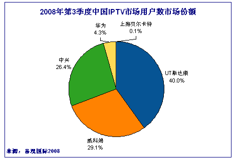 根據(jù)易觀國(guó)際(Analysys International)的研究顯示,2008年第3季度廠商的競(jìng)爭(zhēng)格局方面沒有顯著變化,中國(guó)IPTV市場(chǎng)主要廠商情況如下: