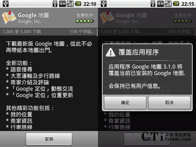 值得注意的是,Google Maps并不會自動推送升級,用戶需要到Market搜索Google Maps手工下載這個升級,版本號為3.10,如下圖: