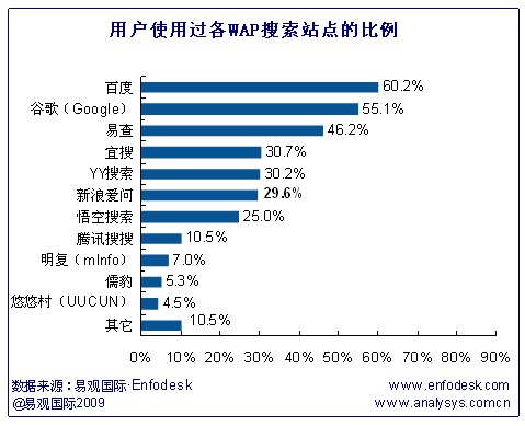 據(jù)易觀國際(Analysys International)《中國移動搜索市場用戶調(diào)研報告2009》研究發(fā)現(xiàn)此次調(diào)研樣本用戶使用過的各WAP搜索站點(diǎn)比例情況基本可以分為三個梯隊: