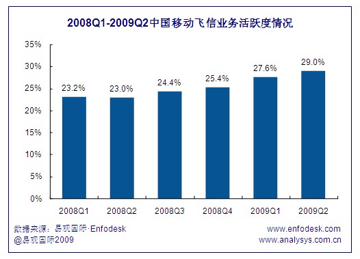 飛信用戶到達(dá)數(shù)的增長(zhǎng)帶來(lái)了活躍用戶的穩(wěn)步提升,截止到2009年第2季度,飛信活躍用戶達(dá)到了5347萬(wàn),與2008年同期相比增長(zhǎng)超過(guò)108.3%。由于一方面飛信到達(dá)數(shù)增長(zhǎng)環(huán)比從2008年第2季度持續(xù)下跌,在2009年第2季度才止跌反彈,相比另一方面飛信活躍用戶的增長(zhǎng)環(huán)比始終保持在15%以上,且從2008年第4季度開始飛信活躍用戶增幅持續(xù)擴(kuò)大,因此近期飛信業(yè)務(wù)用戶活躍度表現(xiàn)出良好的增長(zhǎng)勢(shì)頭。