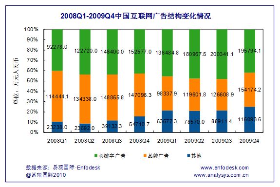 品牌廣告則繼續(xù)保持上升趨勢,2009年第4季度,其市場規(guī)模達到15.4億元,環(huán)比增長21.8%,同比小幅上升4.8%。增長來源主要是快消品、互聯(lián)網(wǎng)產(chǎn)品及服務(wù)以及汽車、通訊行業(yè)等。