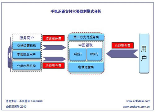 根據(jù)Enfodesk易觀智庫近期發(fā)布的《中國手機(jī)支付市場系列專題報(bào)告2010——近距支付》報(bào)告顯示,手機(jī)近距支付的主要盈利模式只有三種:即前向用戶服務(wù)費(fèi)、結(jié)算手續(xù)費(fèi)和后向商戶服務(wù)費(fèi)。