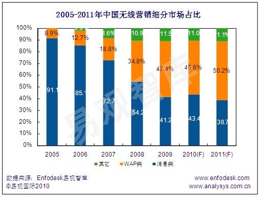 根據(jù)Enfodesk易觀智庫(kù)近期發(fā)布《中國(guó)無(wú)線營(yíng)銷市場(chǎng)專題報(bào)告2010》顯示, 2009年中國(guó)無(wú)線營(yíng)銷市場(chǎng)WAP類廣告在無(wú)線營(yíng)銷整體占比達(dá)47.4%,其規(guī)模同比增長(zhǎng)76.8%,與消息類廣告同比下跌1.3%相比WAP類廣告,已成為無(wú)線營(yíng)銷市場(chǎng)最大推動(dòng)力量。