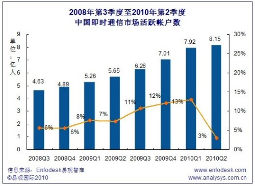 2010Q2中國即時通信市場活躍帳戶數(shù)超過8億