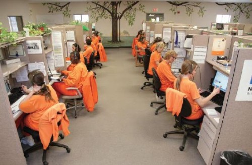 但古德溫邁出了回歸體面人生的艱難步伐,并已獲得了一份工作,4月份刑滿后可上任,這一切都多虧了一家名為威爾帝電信(Televerde)的公司。該公司在佩里維爾監(jiān)獄運(yùn)營著四個呼叫中心,包括250名輪候上班的身著橘黃色連身衣的“女士”(員工們很享受這個稱呼),員工必須接受脫衣搜查,有時還要接受保安的盤問。但一旦戴上耳機(jī),她們就進(jìn)入了另一個世界。“在那里可以重拾自尊!惫诺聹乇硎荆褳槌霆z后的生活攢下了8,000美元的儲蓄。威爾帝電信是一家私營企業(yè),董事長詹姆斯·胡克(James