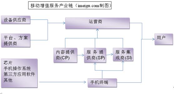 中國電信,中國移動,中國聯(lián)通是中國的三大電信運營商。移動增值服務和移動支付解決方案已構(gòu)成了移動運營商的兩大收入來源。移動增值業(yè)務是包括所有增進移動用戶體驗的非話音服務,在中國目前主要的四大移動增值業(yè)務是:短信、彩信、WAP和彩鈴業(yè)務。移動增值業(yè)務的產(chǎn)業(yè)鏈如下圖所示: