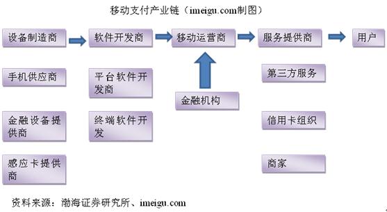 移動支付業(yè)務產(chǎn)業(yè)鏈主體由設(shè)備制造商、銀行、信用卡組織、移動運營商、移動支付服務提供商(或移動支付平臺運營商)、商業(yè)機構(gòu)、SIM卡供應商、手機供應商、用戶等多個環(huán)節(jié)組成。