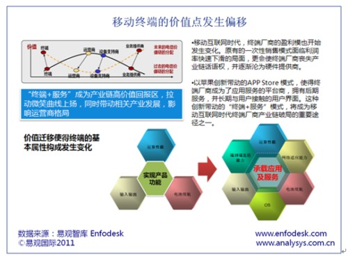 易觀智庫(kù)Enfodesk在近期發(fā)布《中國(guó)移動(dòng)互聯(lián)網(wǎng)市場(chǎng)年度綜合報(bào)告2011》中認(rèn)為,隨著3G的普及以及多元化移動(dòng)應(yīng)用的出現(xiàn),智能手機(jī)取代功能手機(jī)已成定勢(shì),導(dǎo)致傳統(tǒng)的移動(dòng)終端價(jià)值點(diǎn)開(kāi)始由產(chǎn)品化向服務(wù)化遷移。終端廠商原有模式也受到極大挑戰(zhàn)。若不進(jìn)行有效轉(zhuǎn)型恐難以在未來(lái)2-3年后的手機(jī)市場(chǎng)生存。
