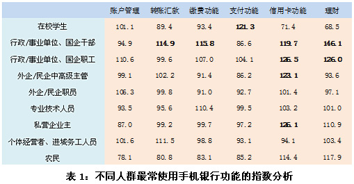 在本次調(diào)研中,對不同人群最常使用手機銀行功能的指數(shù)分析表明,在校學(xué)生更傾向于經(jīng)常使用手機銀行支付功能,較少使用手機理財功能;行政/事業(yè)單位、國企干部更傾向于使用手機銀行的轉(zhuǎn)賬匯款功能、繳費功能、信用卡功能和理財功能,尤其是理財功能;行政/事業(yè)單位、國企職工經(jīng)常使用信用卡功能和理財功能的傾向性也非常明顯;外企/民企中高級主管則更傾向于經(jīng)常使用信用卡功能;私營企業(yè)主經(jīng)常使用手機銀行信用卡功能的傾向性顯著。