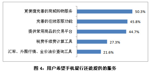 根據(jù)用戶調(diào)研數(shù)據(jù)分析,超過四成的手機銀行用戶能夠接受對金融產(chǎn)品如手機炒股和手機支付實行收費,同時,有約兩成的用戶能夠接受對手機游戲和手機地圖導(dǎo)航實行收費。這表明,對特定的手機應(yīng)用服務(wù)收費能夠得到部分用戶的接受和認(rèn)可。