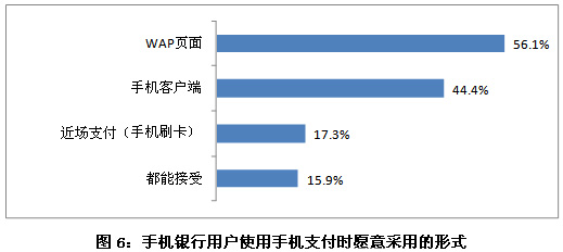 另外,手機銀行用戶使用手機支付時,首選的是WAP頁面,56.1%的用戶更愿意采用這種形式。其次是手機客戶端,其比例為44.4%。近場支付(手機刷卡)這樣支付形式較為新穎,愿意使用的用戶比例僅占17.3%。此外,有15.9%的人以上三種方式都能接受。