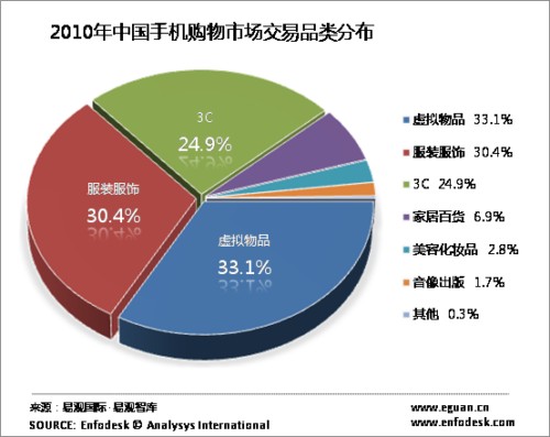 根據(jù)易觀智庫(kù)Enfodesk發(fā)布的《2010年第4季度中國(guó)手機(jī)購(gòu)物市場(chǎng)季度監(jiān)測(cè)》數(shù)據(jù)顯示,2010年中國(guó)手機(jī)購(gòu)物市場(chǎng)交易規(guī)模達(dá)到41億元。其中虛擬類(lèi)商品交易規(guī)模達(dá)12億,占總體交易規(guī)模比例為33.1%。