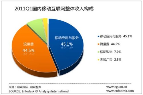 從2011年第1季度移動互聯(lián)網(wǎng)收入構(gòu)成,我們發(fā)現(xiàn)移動應用與服務(wù)仍然是主要營收,占總體市場的45.13%。而流量費依然占據(jù)44.45%的份額。而移動購物,無線廣告營收占比增長有限,分別占7.89%和2.52%。
