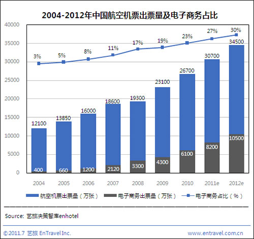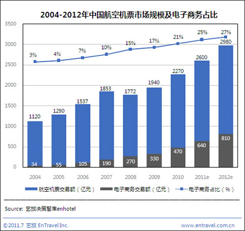 2011年上半年中國機票電子商務交易額達310億元,同期民航機票交易額為1250億元,電子商務占比升至25%,距美國45%的滲透率仍有差距。預計2011全年中國航空機票電子商務交易額將達640億元,而民航機票交易額將達2600億元。
