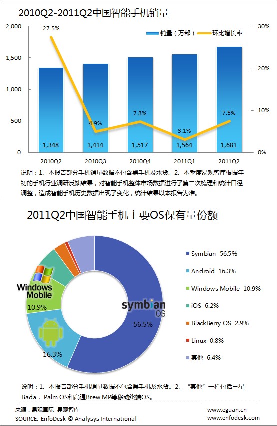 CTI論壇(ctiforum)4月29日消息(記者 潘婷婷):根據(jù)易觀智庫EnfoDesk近期發(fā)布數(shù)據(jù)顯示,中國智能手機(jī)市場2011年第2季度國內(nèi)銷售總量達(dá)1681萬部(不計黑手機(jī)和水貨手機(jī)),環(huán)比增長7.5%。