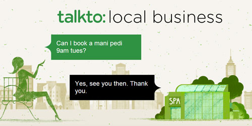 這一切是怎樣實(shí)現(xiàn)的呢?TalkTo通過短信與商家溝通。用戶可以通過web應(yīng)用在TalkTo目錄中搜索需要的服務(wù),輸入商家的詳細(xì)地址或者大概位置,TalkTo就可以確保商家看到用戶的短信。TalkTo用戶可以向商家提出問題和意見,或直接預(yù)定服務(wù)!斑@一切就像和朋友發(fā)短信一樣簡單!