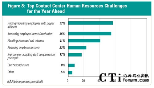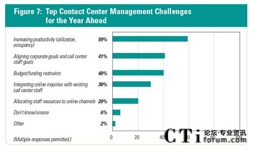 73%的公司表示,呼叫中心是公司面向客戶的窗口。 57%的呼叫中心管理者正在經(jīng)歷答疑或保持員工在中心擁有合適的技能。此外,41%的人表示,處理增加的呼叫量是呼叫中心未來一年面臨的主要挑戰(zhàn)。