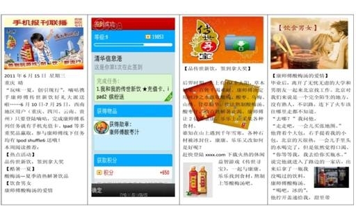 作為快消業(yè)的巨頭,康師傅一直不遺余力地探索新型營(yíng)銷(xiāo)方式,旨在拋棄以往單向、刻板的傳播思路,帶給消費(fèi)者全新的品牌體驗(yàn),“傳世新飲”作為康師傅創(chuàng)新?tīng)I(yíng)銷(xiāo)方式代表者,定位于中華傳統(tǒng)飲品,希望把中國(guó)傳統(tǒng)飲料發(fā)揚(yáng)光大,所以其理想的消費(fèi)群體是20—29歲地年輕人群,而手機(jī)是這部分人接收信息、互動(dòng)娛樂(lè)的重要渠道,開(kāi)展移動(dòng)營(yíng)銷(xiāo)也是據(jù)此作出的選擇。在與國(guó)內(nèi)領(lǐng)先的全方案移動(dòng)營(yíng)銷(xiāo)服務(wù)提供商百分通聯(lián)的合作中,康師傅一改單純的促銷(xiāo)形式,選擇了近來(lái)深受學(xué)生歡迎的手機(jī)位置化簽到和APP互動(dòng)小游戲進(jìn)行整合,并打通了微博、論壇、彩信手機(jī)報(bào)刊廣告、彩信等進(jìn)行立體化傳播,從而發(fā)揮出驚人的傳播能力。