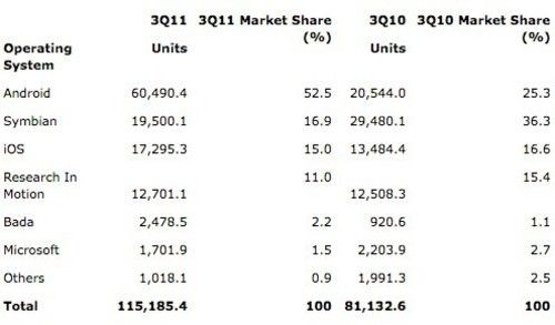 Gartner:Android系統份額52.5% 同比2010年翻番