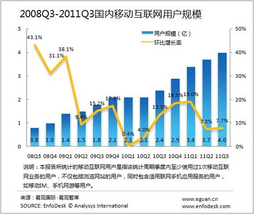 2011第3季度國內(nèi)移動互聯(lián)網(wǎng)用戶規(guī)模接近4億
