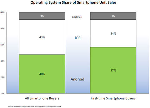 Android和iPhone一共占據(jù)了第四季度智能手機(jī)銷售總量的90%。Android在四季度依舊保持了48%的智能手機(jī)市場份額,同時Android設(shè)備在首次購買智能手機(jī)的消費(fèi)者群中表現(xiàn)更好。根據(jù)NPD每月提供的Smartphone Track服務(wù)的最新數(shù)據(jù),所有在第四季度初次購買智能手機(jī)的消費(fèi)者中,其中57%的消費(fèi)者選擇了Android設(shè)備,而相比較下只有34%的消費(fèi)者選擇了iPhone。