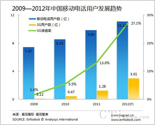 EnfoDesk易觀智庫(kù)分析認(rèn)為,從手機(jī)普及程度的趨勢(shì)來(lái)看,移動(dòng)電話用戶的增長(zhǎng)將逐漸減緩,預(yù)計(jì)2012年將達(dá)11.1億。