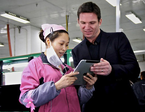 比爾·威爾向富士康一名員工周小穎(Zhou Xiaoying,音)展示他的iPad。iPad曾經(jīng)就在這家富士康工廠的一樓組裝。